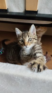 Auxo n’est pas un chaton en mode tornade : c’est un petit cœur délicat, qui observe, réfléchit, puis vient chercher les câlins en toute confiance.