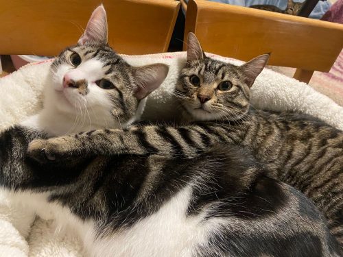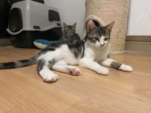 Nous, c’est AEROS (tabby et blanc) et AMOS (tigré), deux inséparables de bientôt 9 mois.