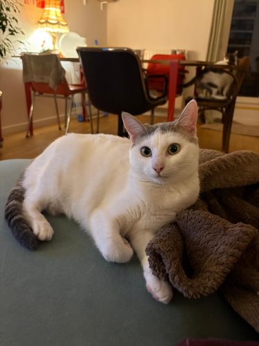 Je miaule très peu et je suis très propre, mais attention aux grandes plantes en pot j’aime bien y grimper (c’est de famille, ça !).